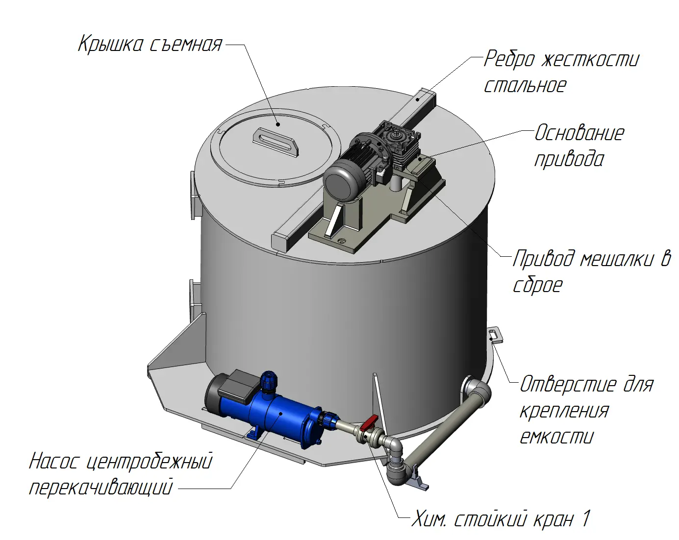 Емкость для приготовления технологических растворов предназначена для приготовления (разведения) компонентов растворов различных электролитов. Заранее подготовленный раствор дозируется в нужном количестве в соответствующие ванны. Изделие обеспечивает безопасную работу на участке гальванопокрытий.