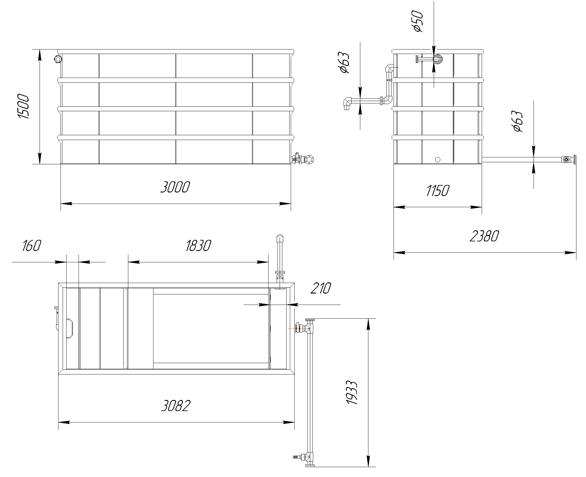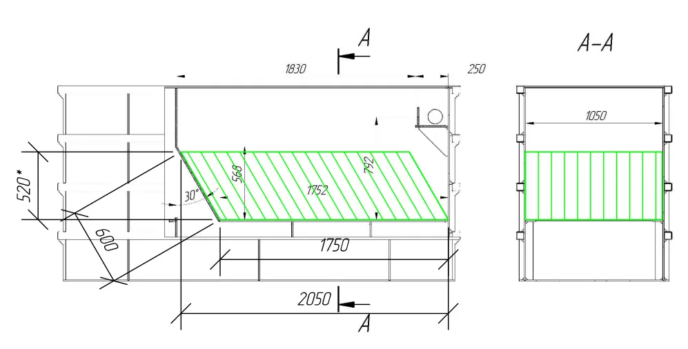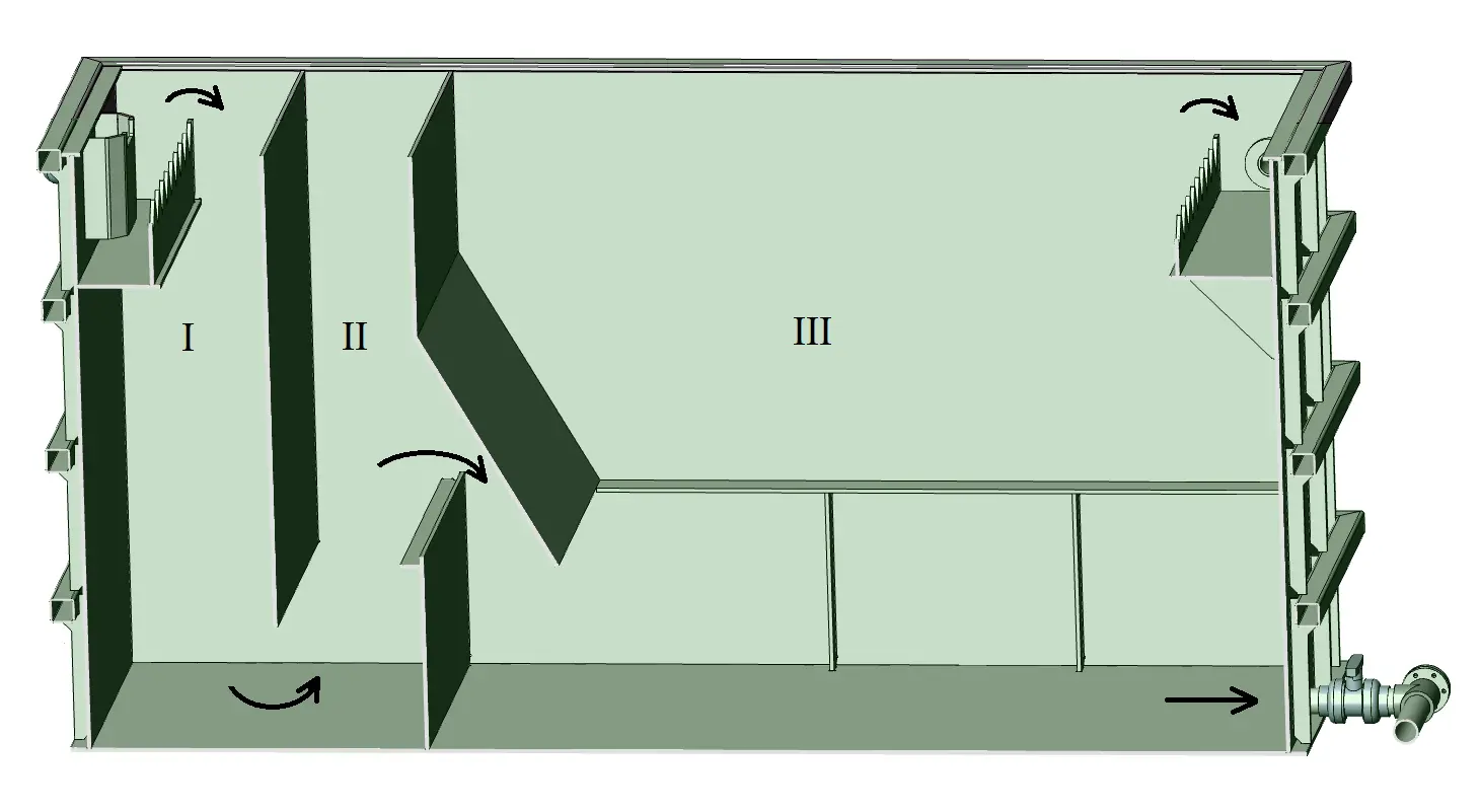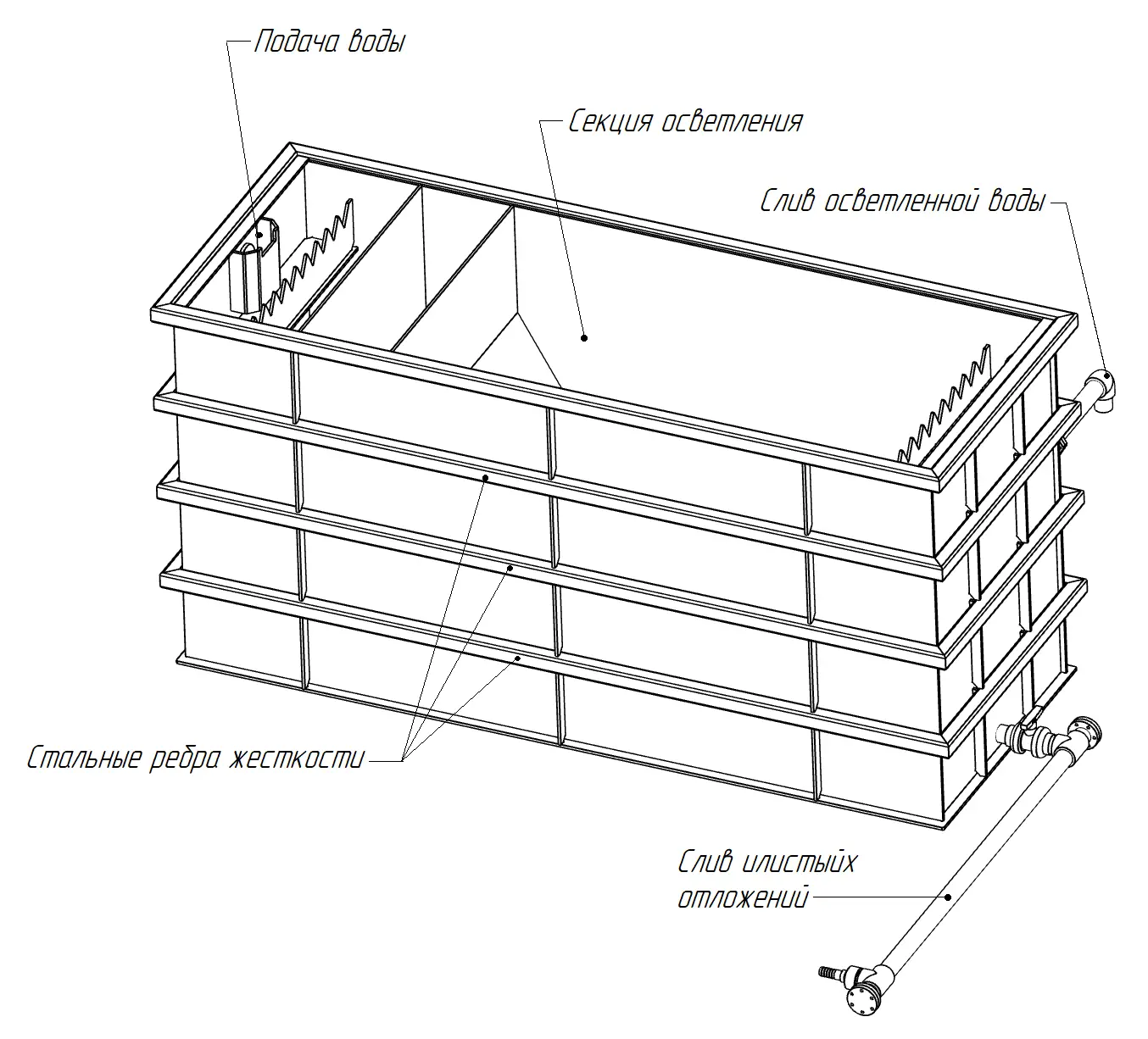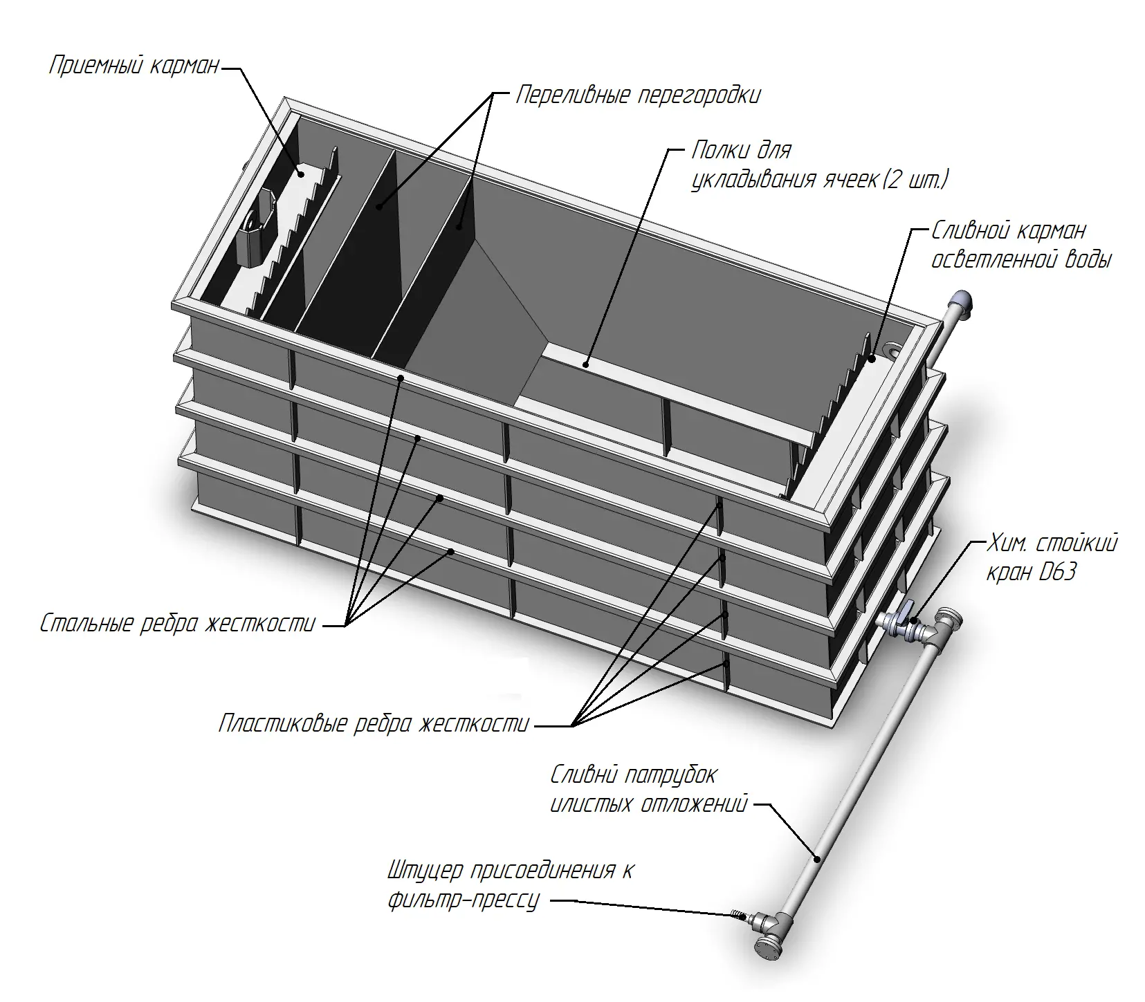 Отстойник тонкослойный горизонтальный предназначен для отстаивания водной взвеси после реагентной очистки сточной воды с целью отделения нерастворимых соединений выпадающих в осадок, при очистке воды. Конструктивно, это емкость, оборудованная трубопроводами подачи и слива жидкости, а также полимерными ячейками, для улавливания загрязнений. Изделие обеспечивает безопасную работу на участке очистных сооружений (участке гальванопокрытий).