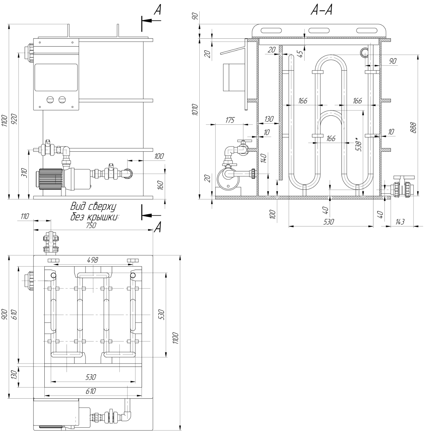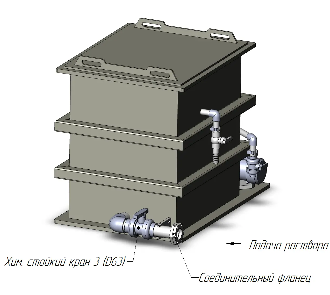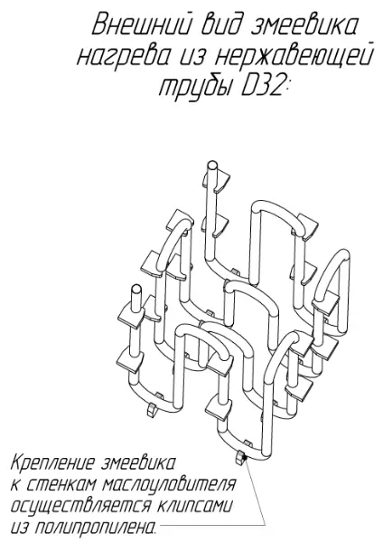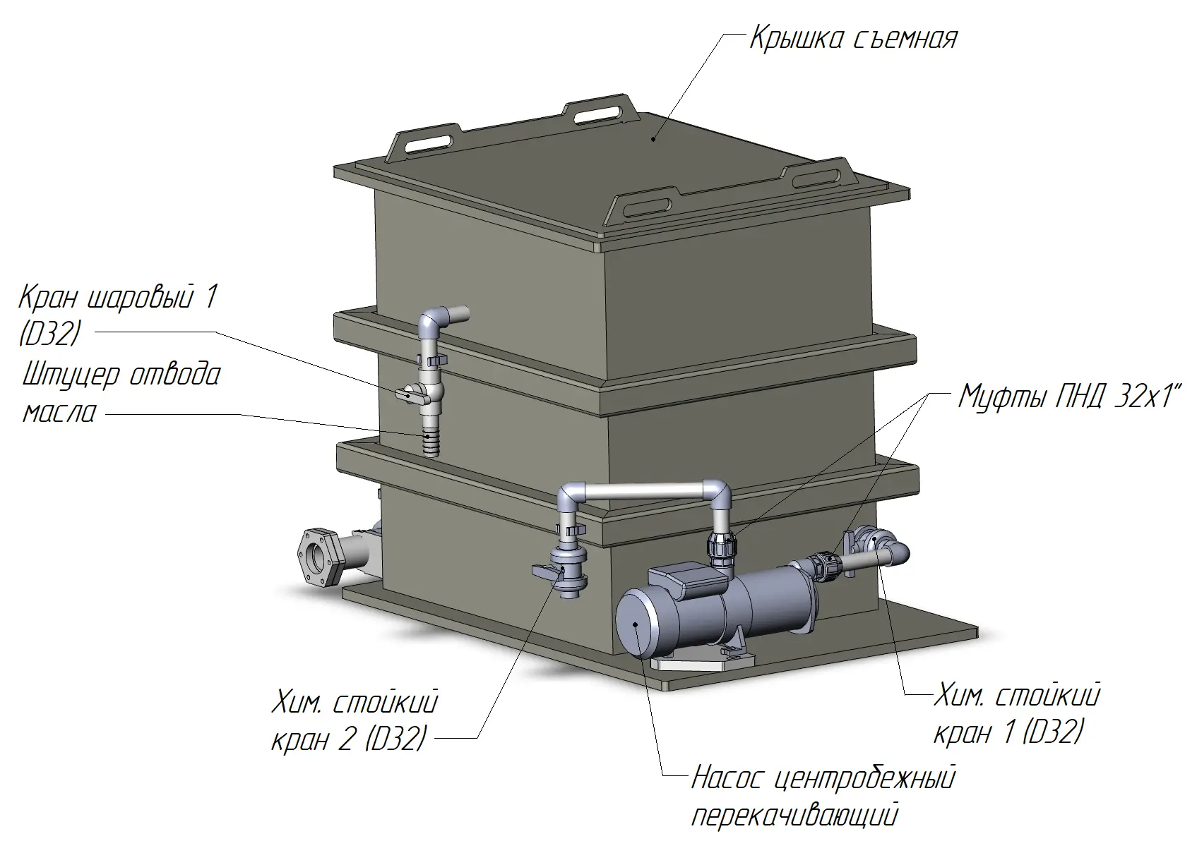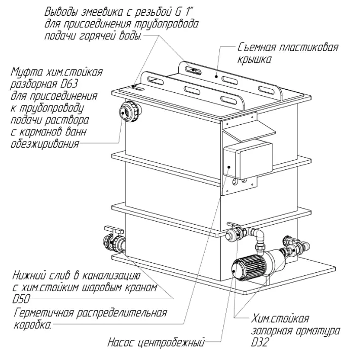 Конструктивно маслоуловитель представляет собой емкость, оборудованную вспомогательными системами нагрева и циркуляции раствора. При изготовлении Изделия учитывались требования ГОСТ 16310-80 «Соединения сварные из полиэтилена, полипропилена и винипласта». Изделие прошло технические испытания на стенде изготовителя. Работа маслоуловителя обеспечивается за счет циркуляции раствора в контуре состоящем из маслосборного кармана ванны, маслоуловителя и технологического трубопровода с насосом. Раствор с маслом стекает в маслоуловитель из маслозборного кармана. После разделения масла и рабочего раствора. Очищенный раствор возвращается в ванну.