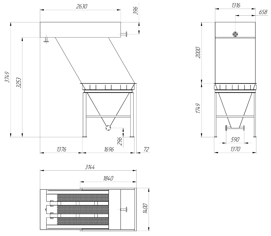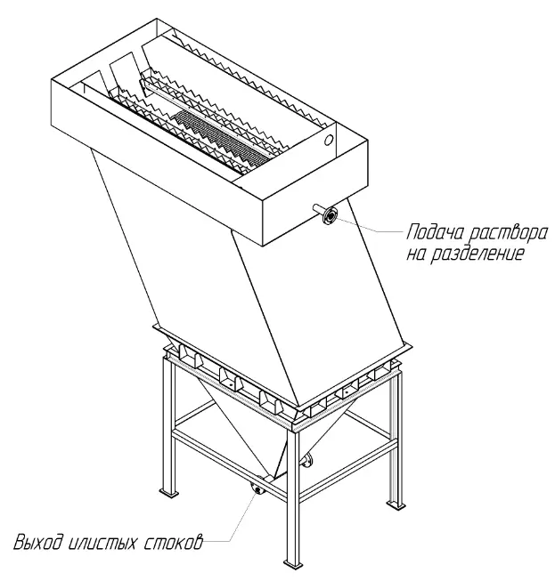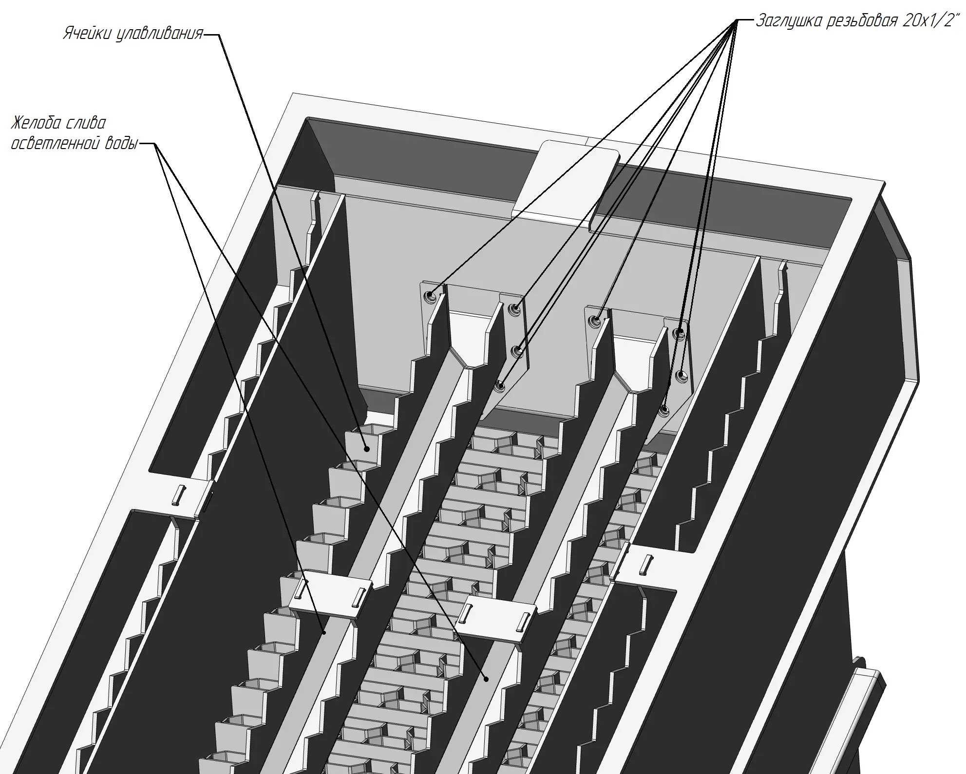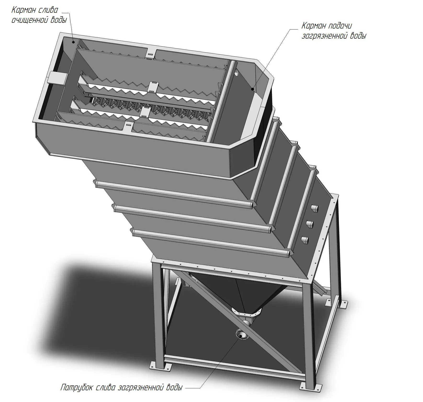 Отстойник наклонный тонкослойнный предназначен для отстаивания водной взвеси после реагентной очистки сточной воды с целью отделения нерастворимой взвеси от чистой воды. Конструктивно, это емкость, оборудованная трубопроводами подачи и слива жидкости, а также полимерными ячейками, для улавливания загрязнений. Изделие обеспечивает безопасную работу на участке очистных сооружений (участке гальванопокрытий).
