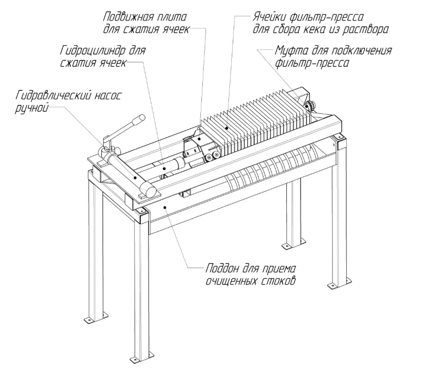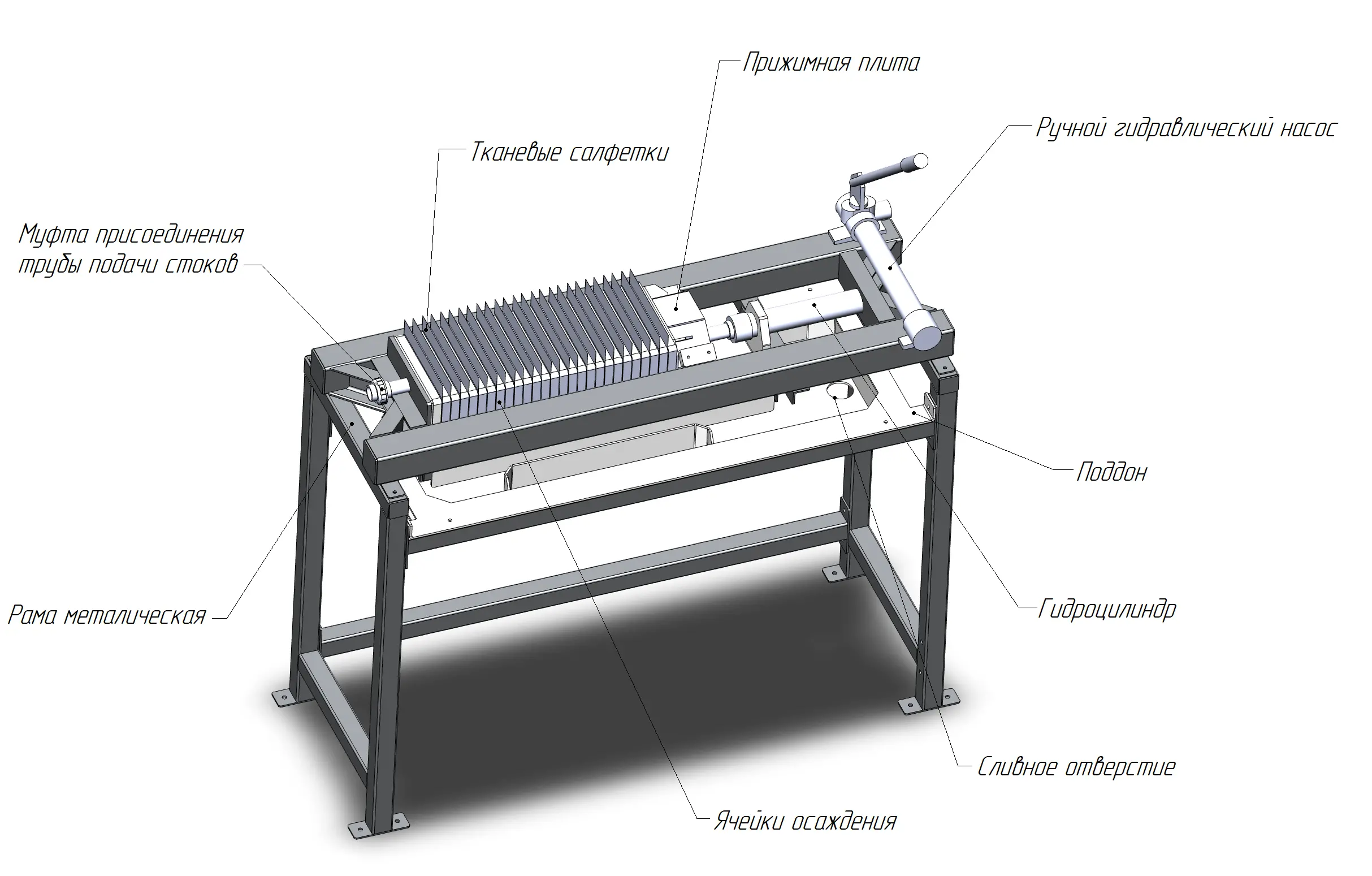 Фильтр-пресс ФП10 предназначен для очистки воды от твердого осадка, образующегося в ходе нейтрализации сточных вод гальванического участка. Изделие обеспечивает безопасную работу на участке гальванопокрытий (очистных сооружений).