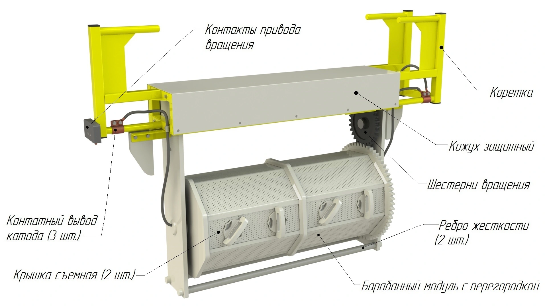 Барабан L1500_8 двухсекционный обеспечивает безопасную работу на участке гальванопокрытий, при соблюдении правил и требований настоящего паспорта.