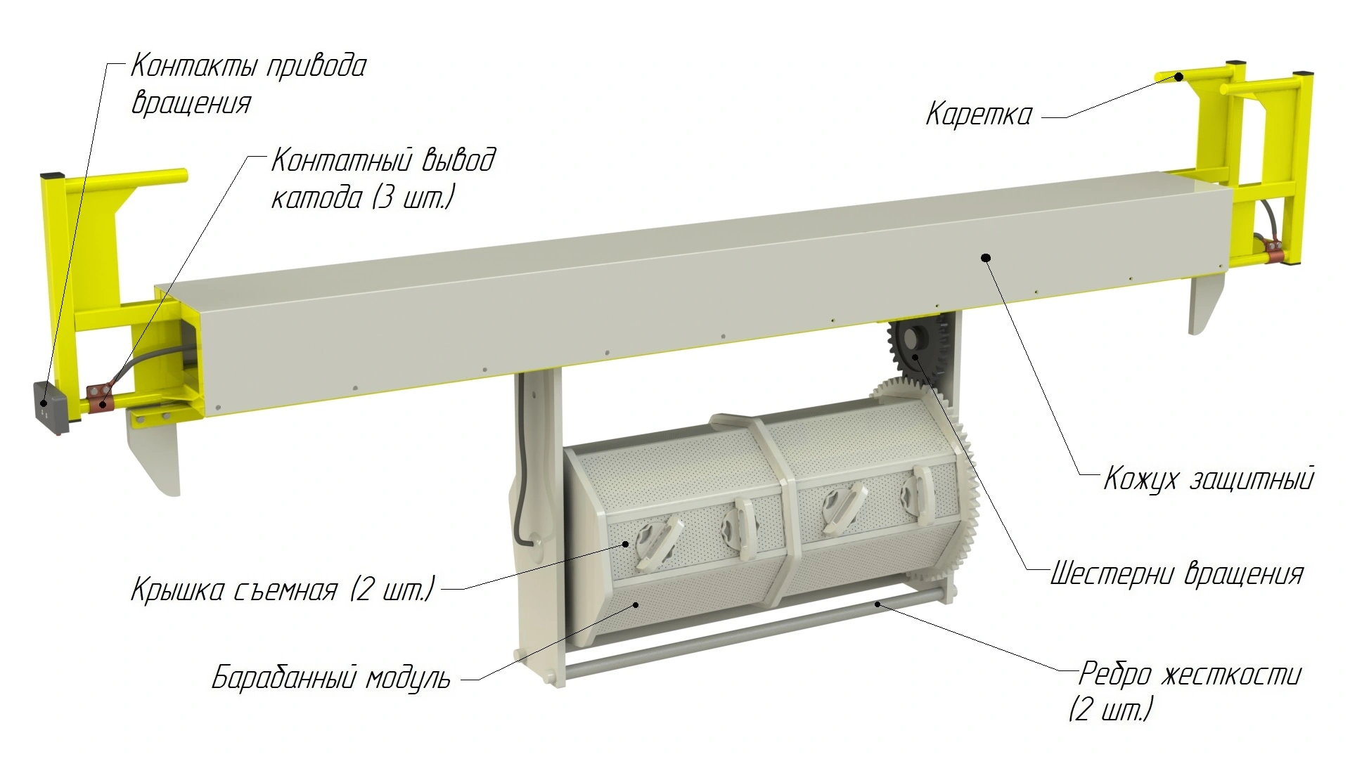 Барабан L3000_8 двухсекционный предназначен для подготовки поверхности и нанесения гальванического покрытия на мелкие детали путем погружения заполненного деталями изделия в технологические ванны длинной 3000 мм, а также для транспортировки деталей вдоль гальванических линий. Изделие представлено в 8-гранном корпусе: двухсекционный.