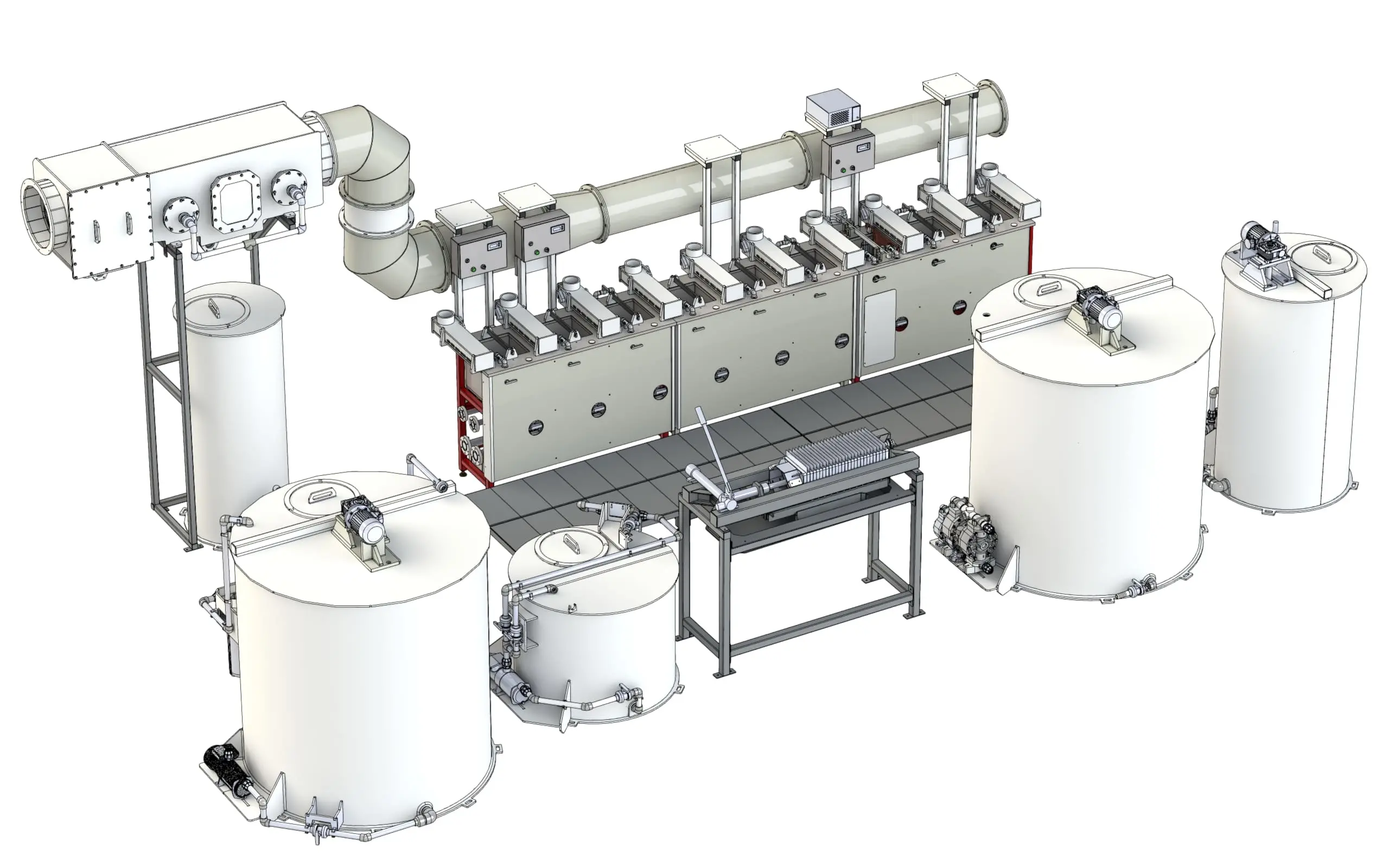 Разделенные стоки, а также соответствующие утилизируемые рабочие растворы, направляются в накопительные емкости посредством дренажных емкостей. Все емкости оборудованы хим стойкими насосами на магнитной муфте, поплавковыми датчиками уровня. Далее, из накопительных емкостей, стоки направляются реактор осаждения, оборудованный механической мешалкой, где выставляется оптимальный уровень рН и дозируется флокулянт. После чего осуществляется осветление стоков посредством фильтр пресса. Осветленные стоки проходят дополнительную обработку трехступенчатой фильтрацией и могут быть слиты в канализацию после контрольной проверки и разведения технической водой до ПДК.