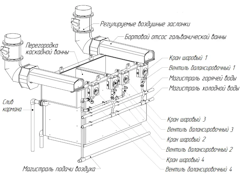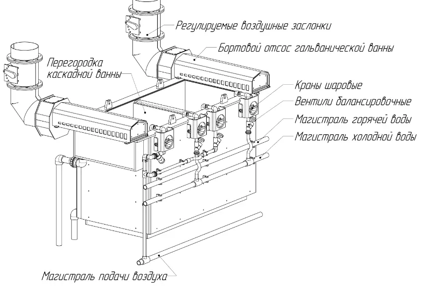 Ванна холодной каскадной промывки предназначена для промывки деталей после различных технологических операций. Наличие двух промывных каскадов обеспечивает улучшение качества промывки и снижение расхода воды. Изделие обеспечивает безопасную работу на участке гальванопокрытий, при соблюдении правил и требований настоящего паспорта.