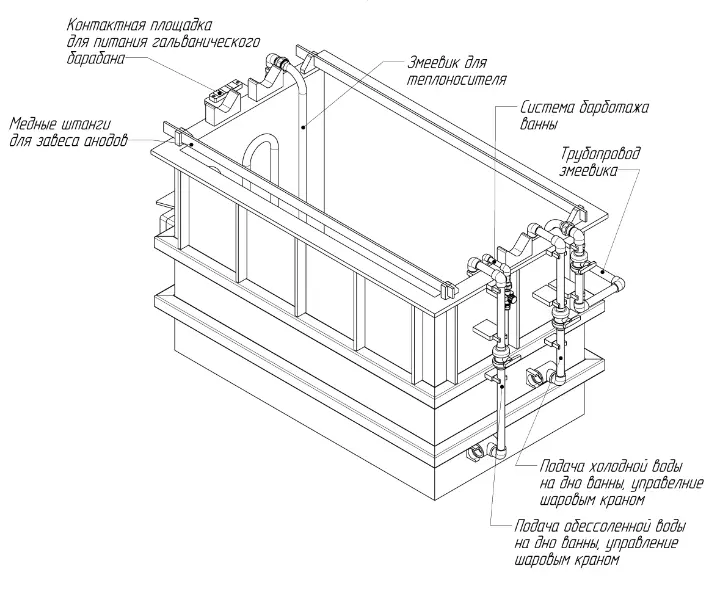 Ванна цинкования предназначена для нанесения металлического цинкового покрытия электрохимическим способом. Изделие обеспечивает безопасную работу на участке гальванопокрытий, при соблюдении правил и требований настоящего паспорта.