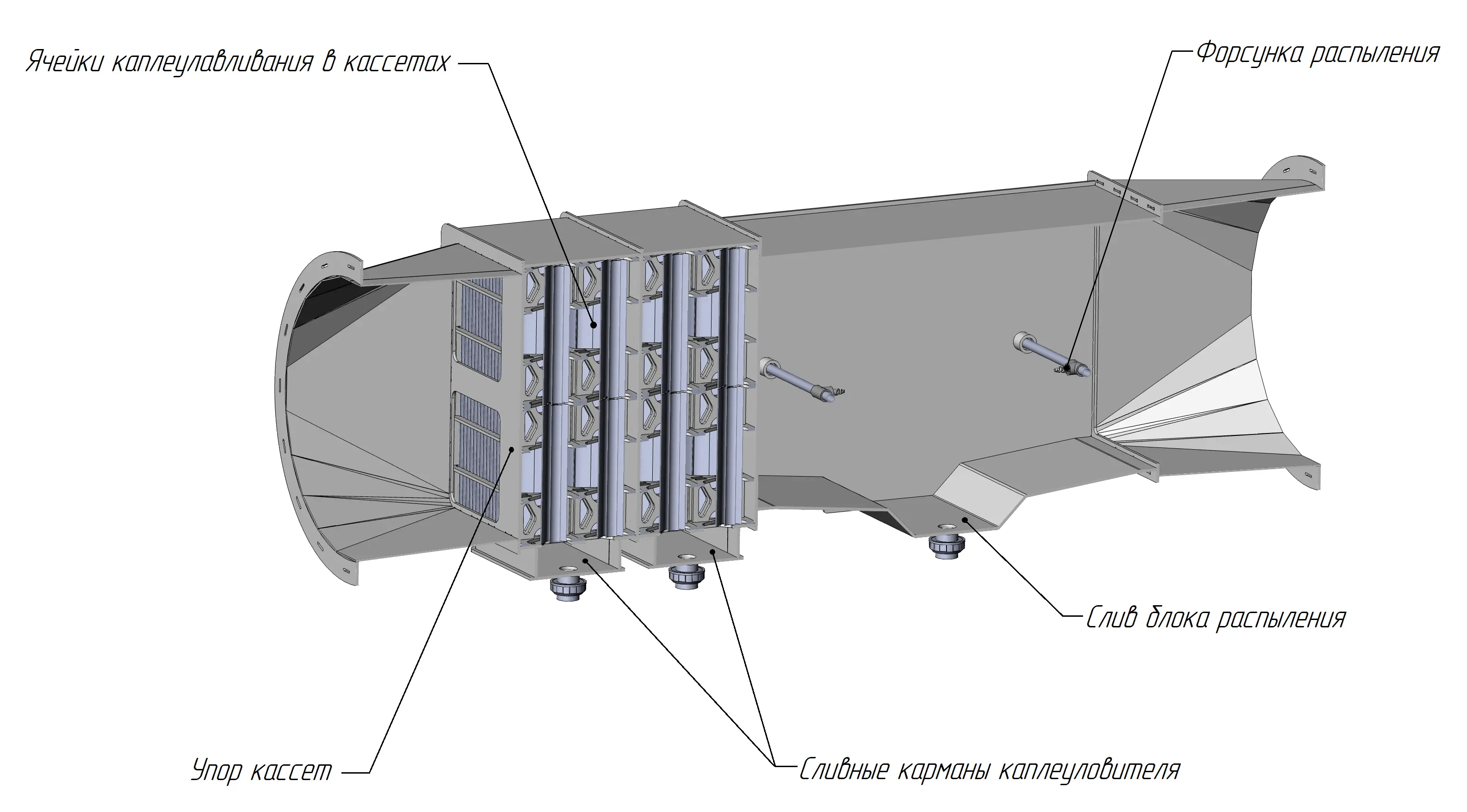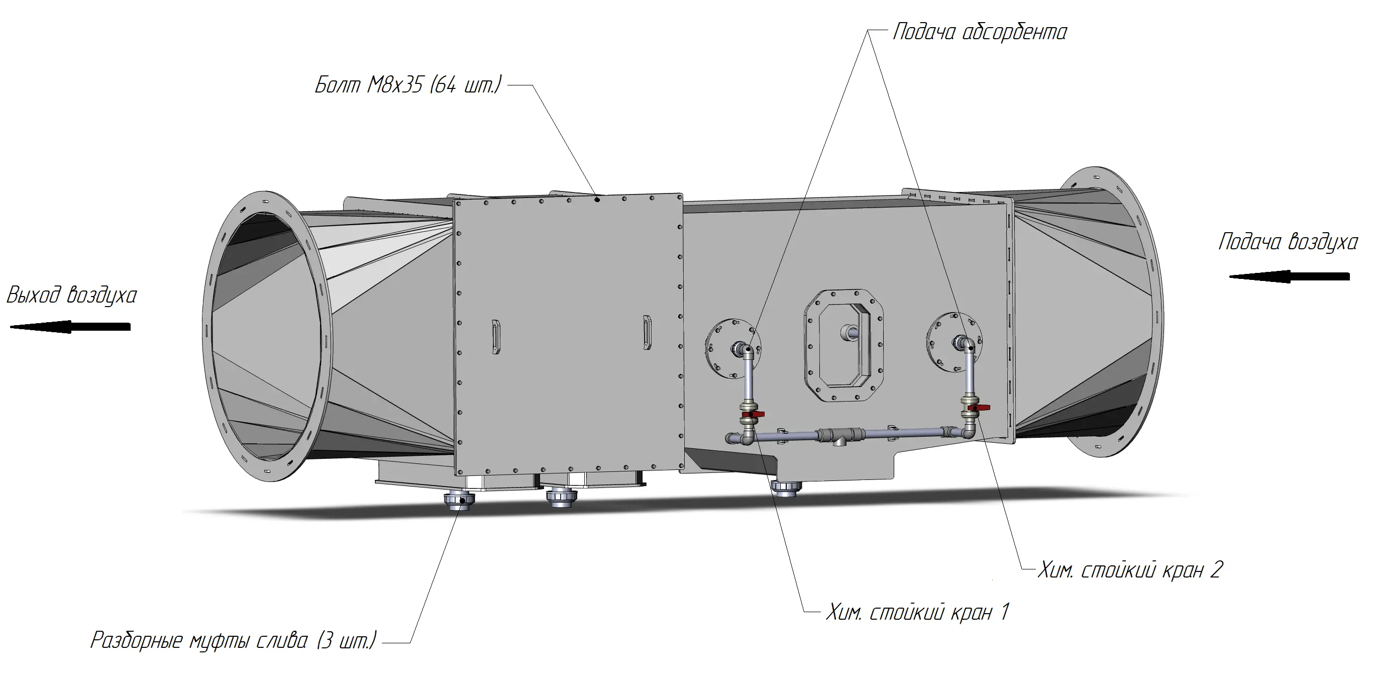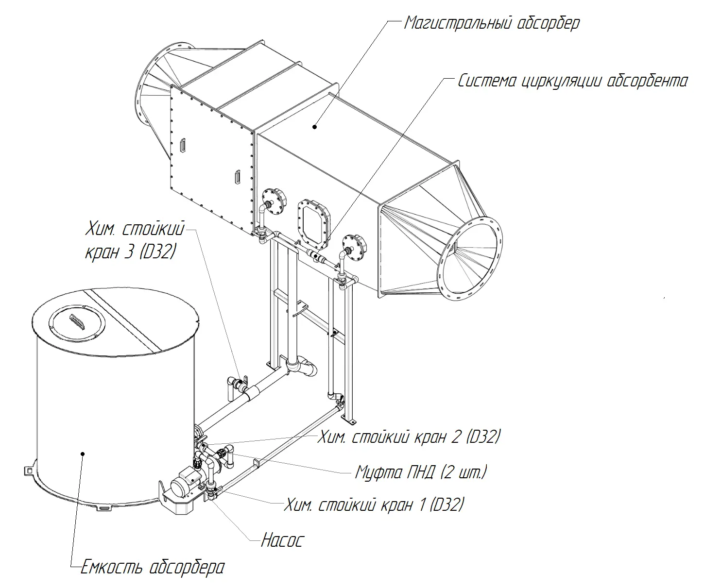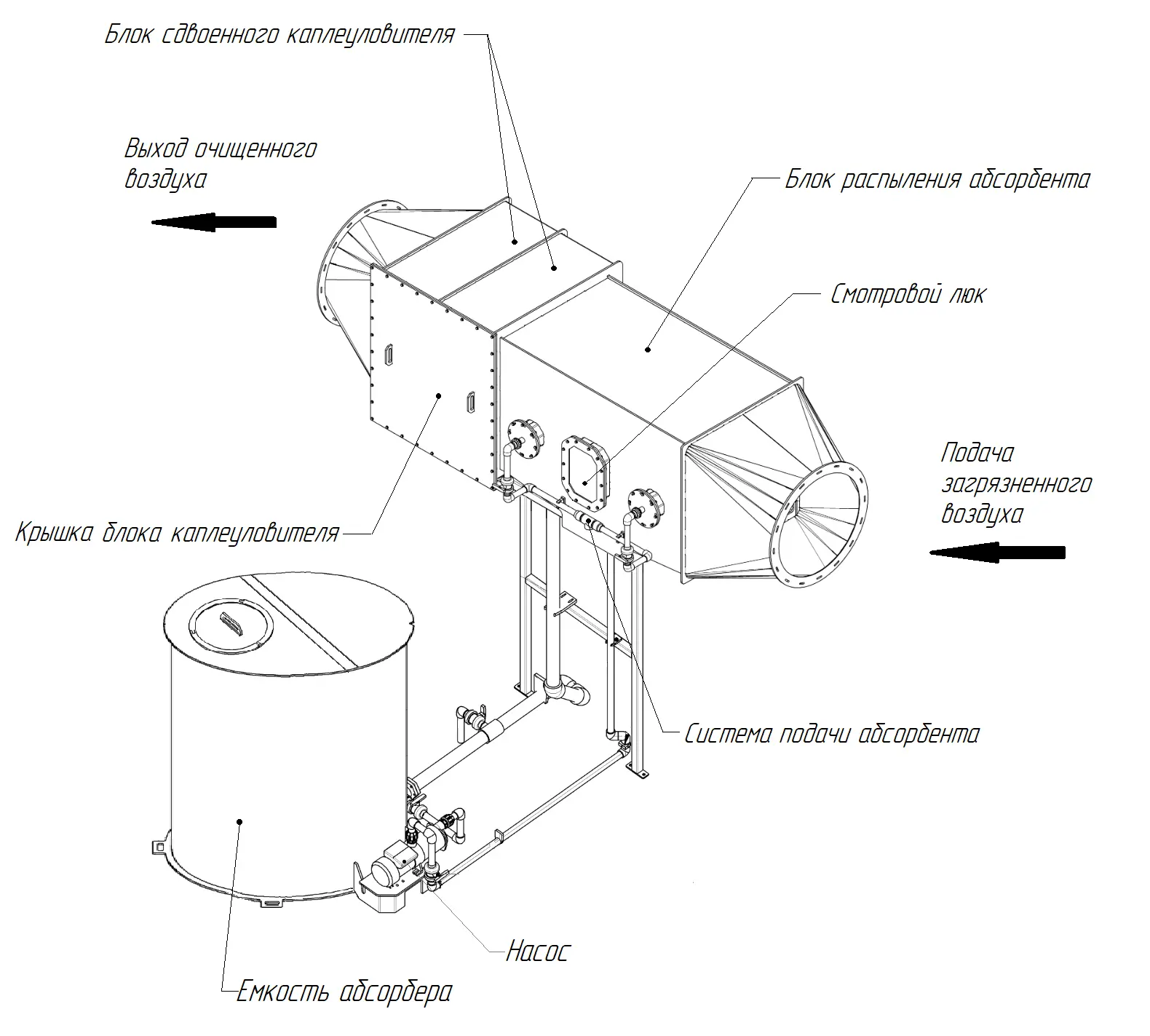 Абсорбер 960-2- предназначен для очистки воздуха, удаляемого от технологических ванн на участке гальванопокрытий местной вытяжной вентиляцией: кислотных, щелочных и иных испарений методом абсорбции (поглощения) загрязнений абсорбентом с образованием водного раствора загрязнений в накопительной емкости. Изделие обеспечивает безопасную работу на участке гальванопокрытий.