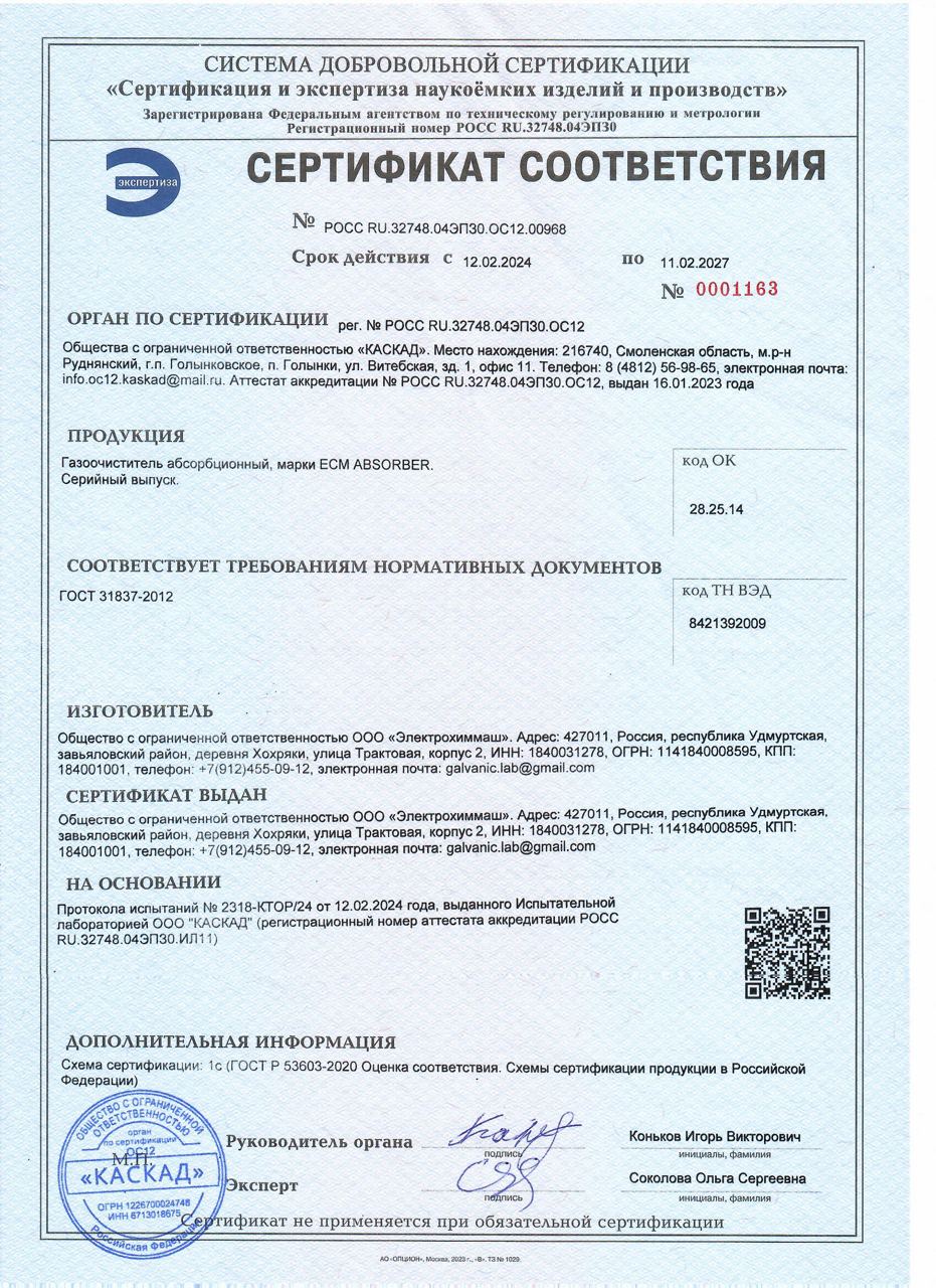 При разработке конструкторской документации изделия, учитывались требования ГОСТ 31837-2012 «Газоочистители абсорбционные. Требования безопасности и методика испытаний». Сертификат соответствия № РОСС RU.32748.04ЭП30.ОС12.00968.